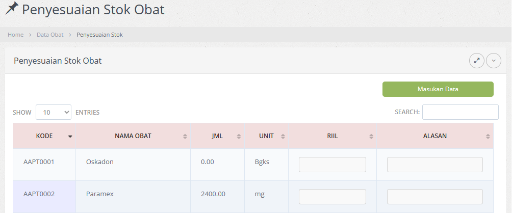 Fitur ini berfungsi untuk membantu kegiatan stock opname, dimana diperlukannya penyesuaian stok obat/bahan antara jumlah yang terdaftar didalam sistem dengan jumlah yang ada dalam bentuk fisik/riil. Klik menu Administrasi > Stok Apotek> Penyesuaian Stok. Tampilannya sebagai berikut:
