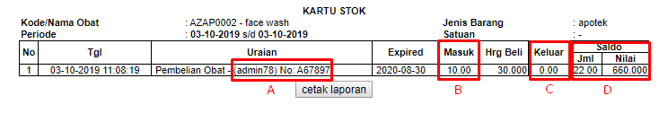 D. Saldo, Jumlah adalah nominal stok yang tersedia. Sedangkan, Nilai adalah nominal stok dikalikan harga beli obat (stok x harga beli).
