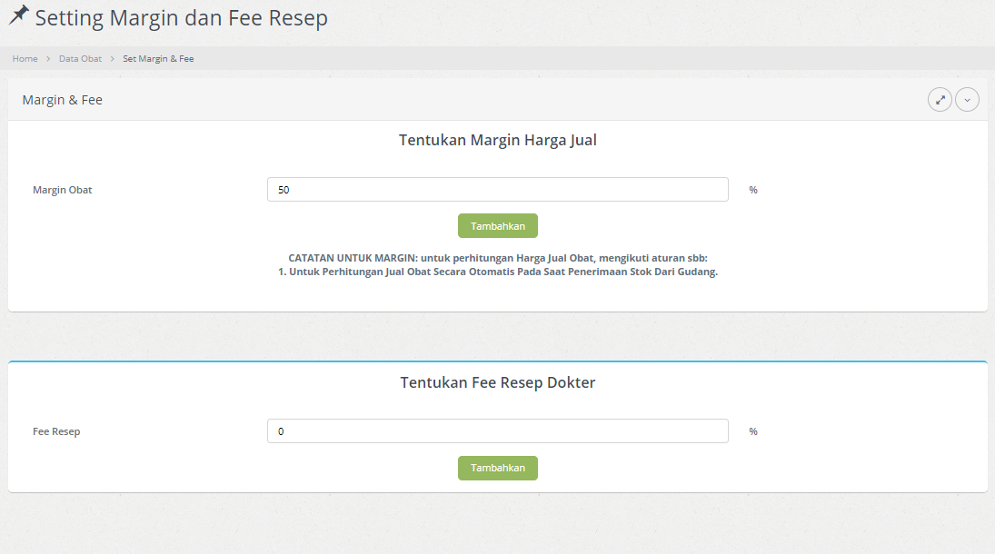 a) Setup Margin Obat : Jika harga jual di data obat bernilai 0 (nol) atau tidak ditentukan, maka harga margin yang akan berlaku. Dan sebaliknya, jika harga jual telah ditentukan, maka harga margin tidak akan berlaku. Perhitungan harga margin adalah harga Jual = harga beli + nominal margin (%).