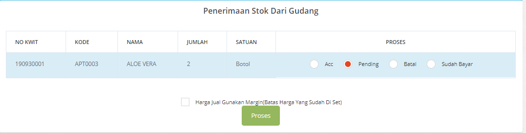 Jika Anda ceklis pada “Harga Jual Gunakan Margin”, maka harga margin yang akan berlaku. Rumus ketentuannya adalah harga jual = harga beli (Rp) x margin (%). Setelah obat/bahan di-acc dan diproses, maka jumlah stok obat tersebut akan otomatis bertambah.