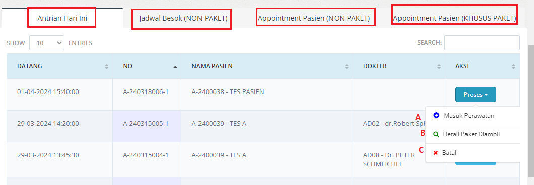 - Appointment Pasien (Khusus Paket) : untuk pasien khusus PAKET yang sudah memiliki janji perawatan berikutnya.