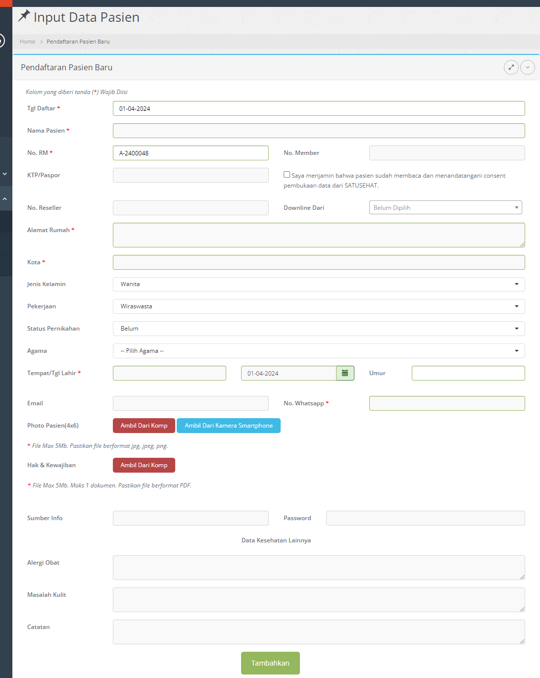 Terdapat banyak kolom untuk input data pasien baru, tetapi hanya beberapa saja yang wajib diisi (kolom yang diberi tanda * warna merah adalah kolom yang wajib diisi). Anda juga dapat ambil foto/upload foto pasien pada form ini, namun foto pasien disini bukanlah foto untuk perawatan, melainkan foto pelengkap identitas pasien. Bagian lainnya yang juga harus diisi adalah kolom no. telp dan email, yang dapat berguna untuk fitur notifikasi otomatis melalui Whatsapp, ataupun Email.