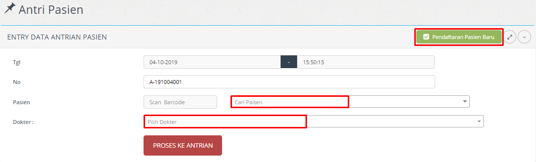 4. Klik PROSES KE ANTRIAN, maka pasien akan masuk ke daftar antrian perawatan seperti dibawah ini: